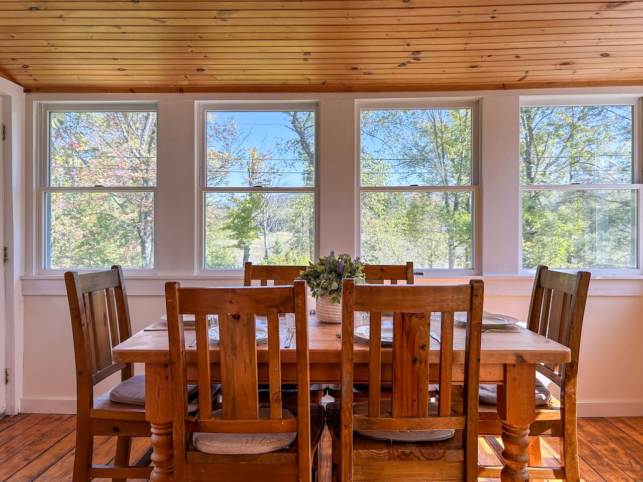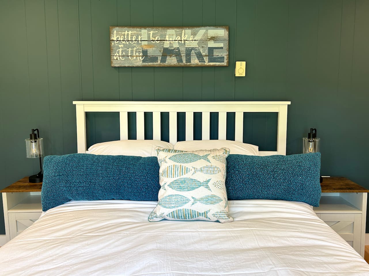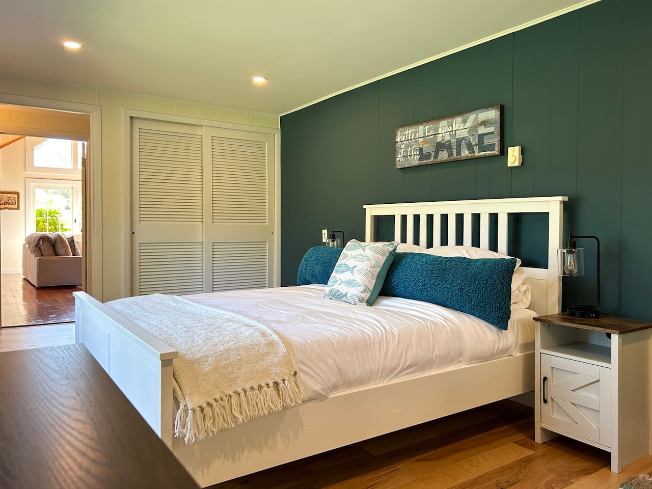 The queen bedroom is located on the ground floor, off of the great room, and has a view of the backyard and the lake in the distance