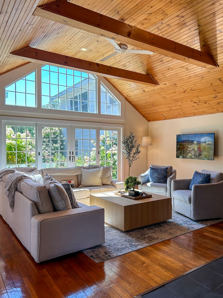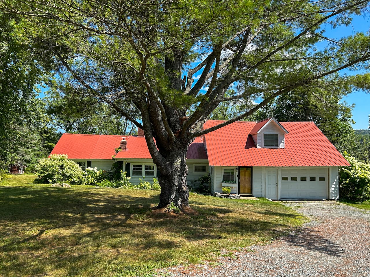Mature hydrangeas surround the property -- shown here in full bloom!